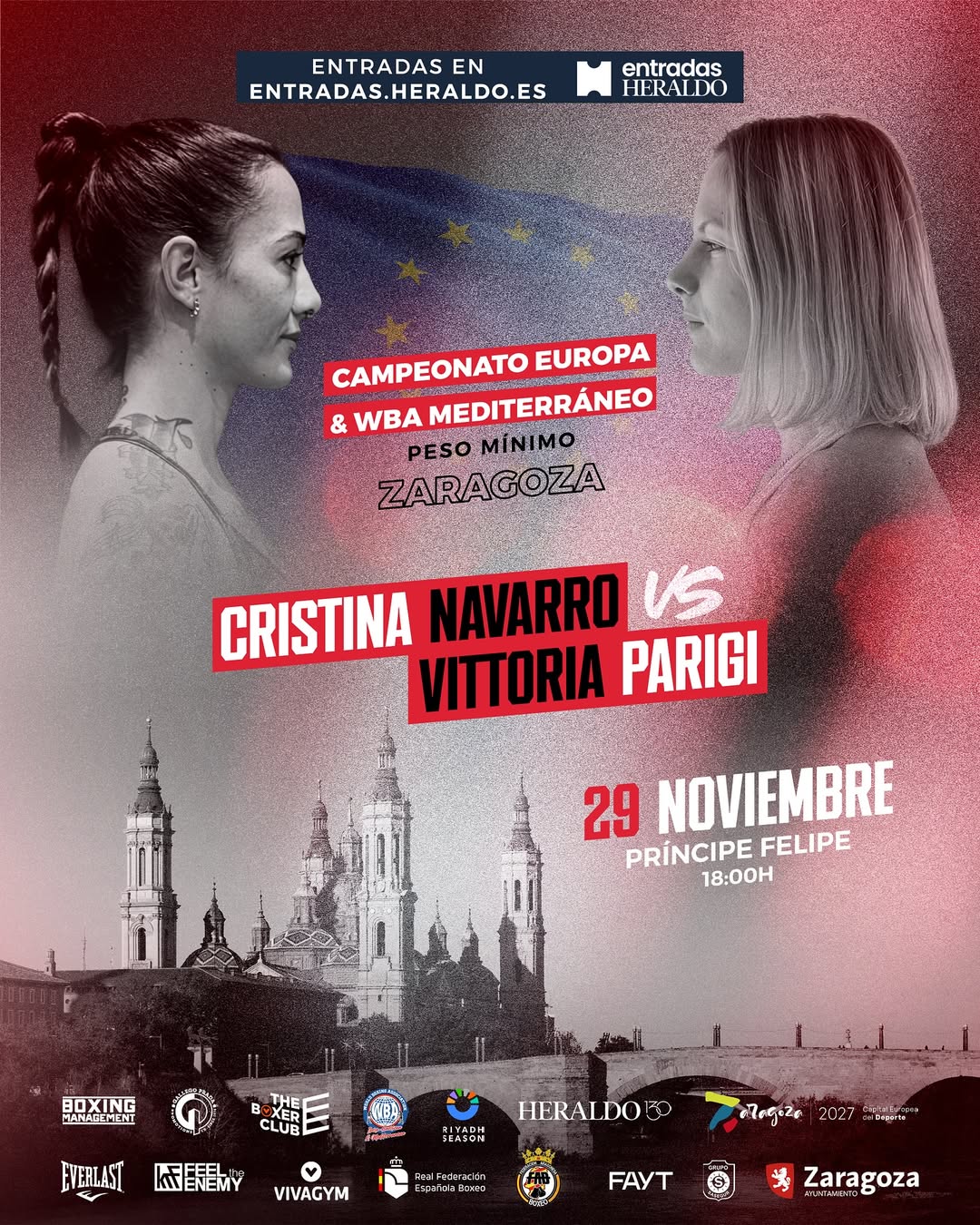 1️⃣ La aragonesa Cristina Navarro “La Piccolina” se enfrenta a la italiana Vittoria Parigi por el Campeonato de Europa (EBU) del peso mínimo y el título Mediterráneo WBA. Cristina llega tras proclamarse campeona Iberoamericana WBA y escalar hasta el nº2 mundial en esa división. Vitoria viene de disputar el EBU en Italia.