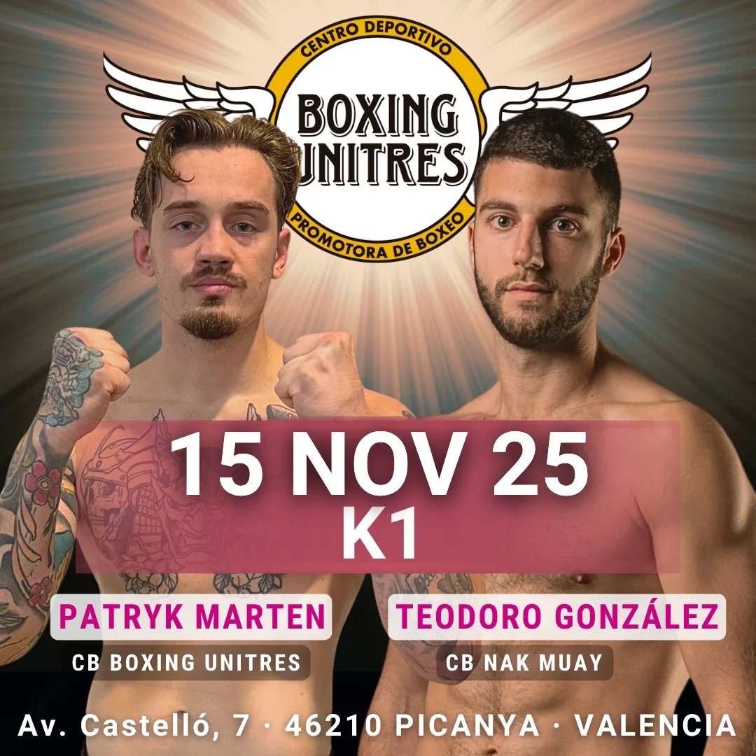 ¿Preparado para la acción? K1: Nuevo rival. Patryk Marten del CB Boxing Unitres se enfrenta a Teodoro González del Club Nak Muay. ¡Emoción asegurada!
