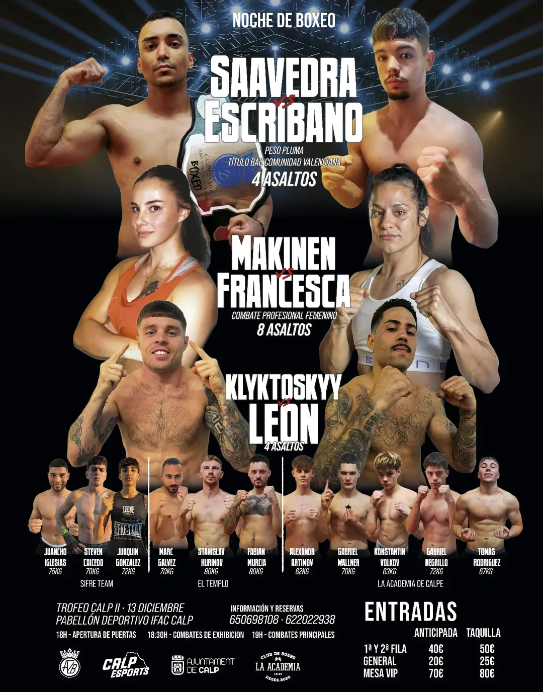 En el semiestral, el boxeador local Santiago 'El Salsero' Saavedra del club La Academia de Calpe defenderá su cinturón de Campeón de la Comunidad Valenciana del peso Pluma, frente al Xirivellense Adrián Escribano.