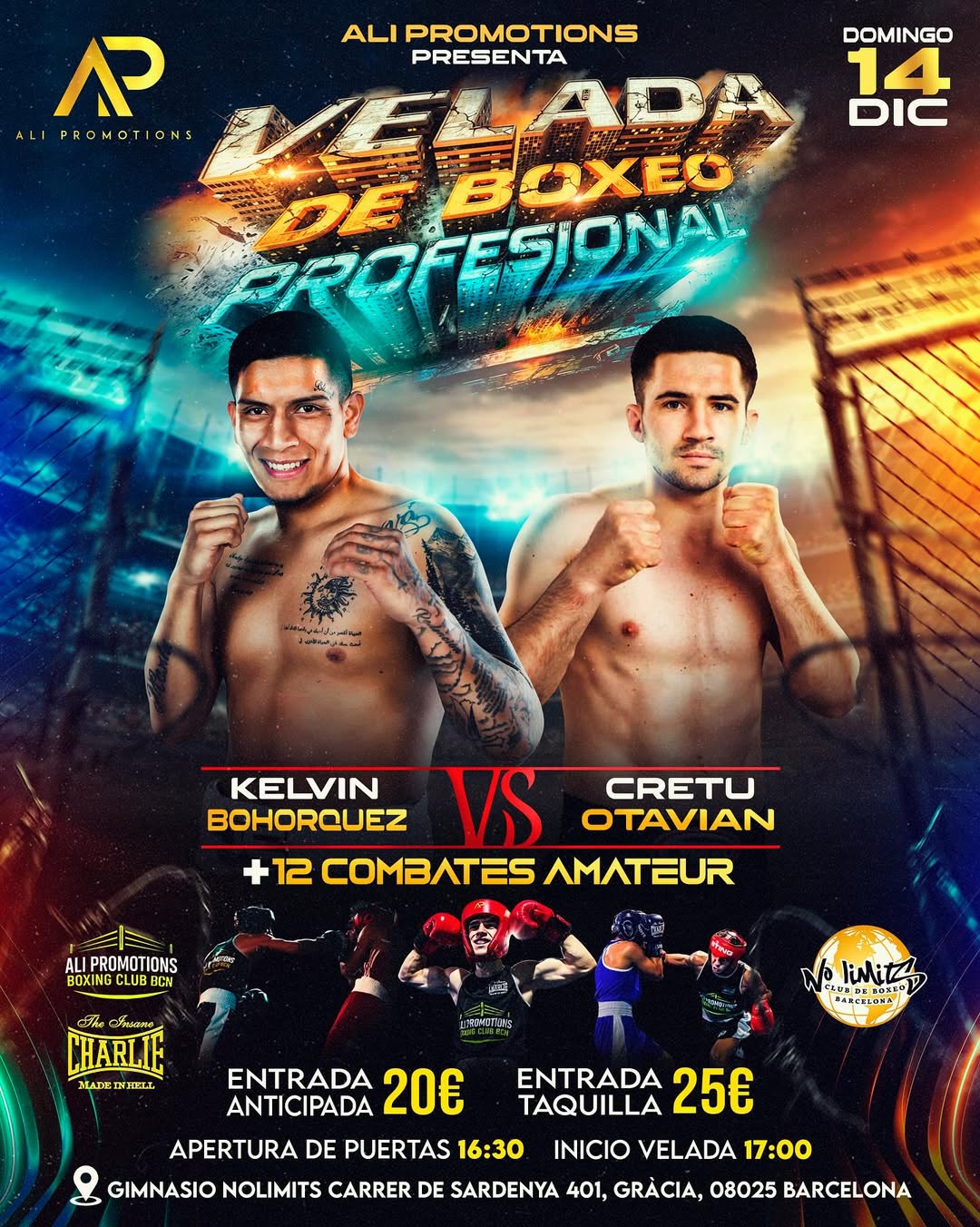 El próximo DOMINGO 14 de Diciembre kelvin Bohorquez protagonizará su tercer combate ante el temido cretu octavian un peleador Muy fuerte y competitivo, donde su carrera deportiva a sido en k1, octavian es un luchador respetado en su país y en esta ocasión protagonizará su tercer combate en la modalidad de Boxeo, va a ser una auténtica Guerra, también tendemos 12 combates amateurs de diferentes gimnasios de la zona, os esperamos!!